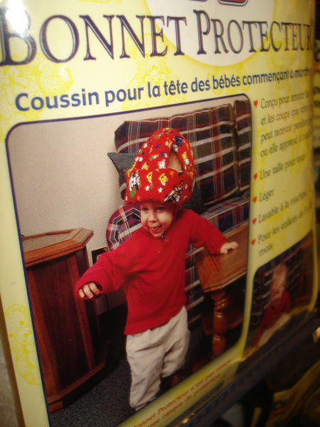 Au La Baie, avec ma maman qui achète un t-shirt Desigual pour sa nièce de six ans, nous regardons tout ce qui se vend pour les bébés. Dans une rangée, il y a deux-trois casques pour bébés qui commencent à marcher. Je commence à pleurer de rire. Ma mère essaie un des casques : « Tu imagines, les enfants qui se promènent avec ça doivent sans doute aussi porter un genre d’armure pour aller au parc? »