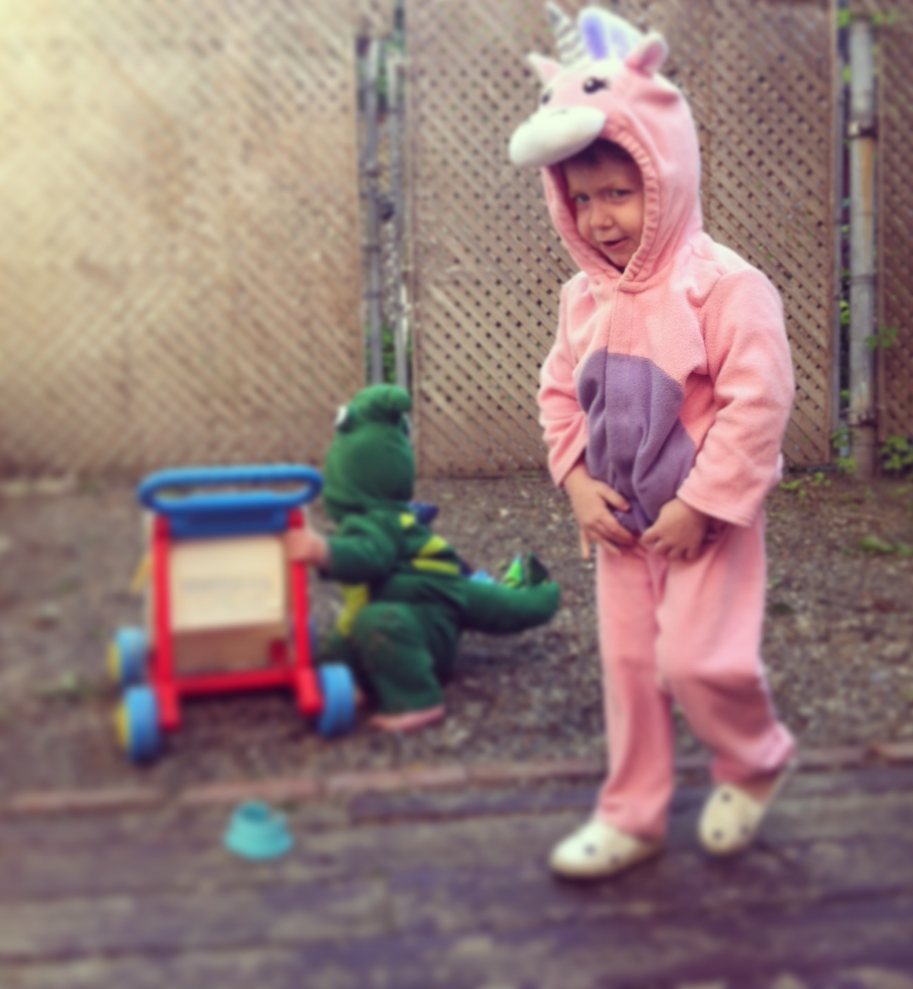 Je regardais des photos avec Mini Fée, quand elle en a vues d’elle déguisée en licorne. Elle a voulu que je retrouve son déguisement d’Halloween, ainsi que celui de son frère. Après trente minutes, Mini Dragon avait l’air tout coincé, alors je le lui ai retiré. Mais Mini Fée a choisi de rester en licorne magique pour se rendre au parc.