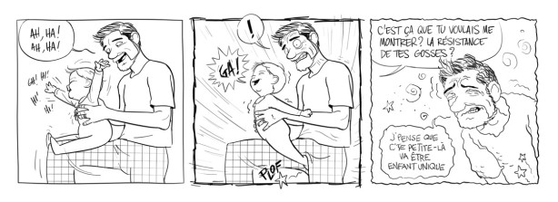 Comme travailleur autonome, j’essaie de m’astreindre à un horaire régulier, ce qui consiste essentiellement à me donner des rendez-vous fixes à la table à dessin. Je me donne des objectifs en heures de travail ou en étapes de réalisation. Je travaille pendant les siestes de la petite, au retour de l’école, après les devoirs, quand les filles peuvent s’amuser ensemble, et de soir, en me bottant le cul, lorsque les enfants sont couchés. Exceptionnellement (et la culpabilité, inévitablement, s’ensuit), je vais ploguer la petite devant des épisodes de Passe-Partout pour travailler en matinée. C’est pas toujours évident de travailler de façon entrecoupée. Mais bon, les deux vont être à l’école à partir de septembre, alors je pourrai bientôt revenir à des horaires plus normaux, profiter d’une meilleure concentration. J’ai hâte.