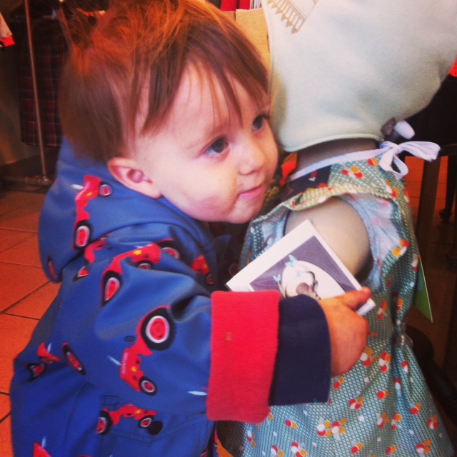 Mon fils est très doux, c’est un Calinours. Il réveille sa soeur en lui faisant des bisous (et en léchant ses mains) (ouan). Parfois, son envie de câlins est tout simplement surprenante. Comme aujourd’hui, lorsque j’étais au Coureur de Jupons, et que Mini Dragon a décidé de tomber en amour avec un mannequin.
