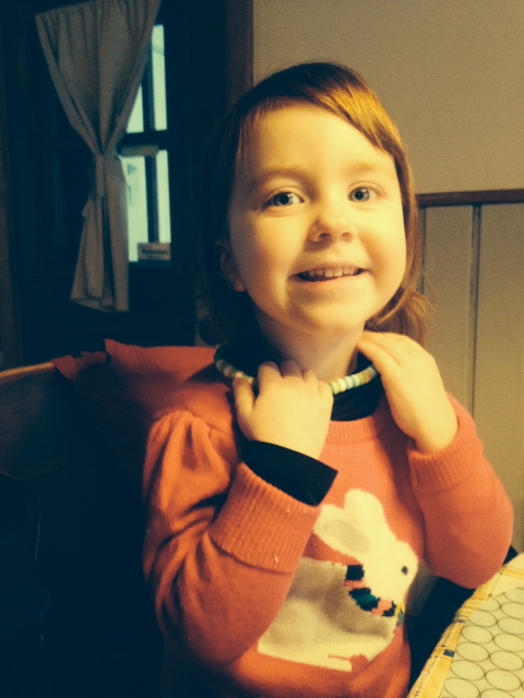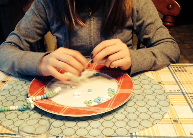 Nous avons fait des colliers de bonbons, après la sieste, l’autre jour. J’ai adoré, voir les enfants tenter d’enfiler les bonbons, sans les croquer d’abord, voir les grosses mains de mon chéri, avec un fil et des bonbons de trois couleurs, les grosses mains de mon chéri qui aidaient mon fils à terminer son collier, et j’ai adoré entendre ma belle-fille me demander de l’aide pour attacher son nouveau bijou.