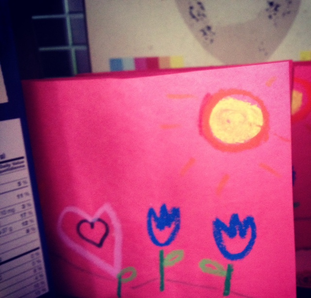 Et ce matin, même si leurs cartes étaient déjà dessinées aux pastels la veille, elles sont restées dans la cuisine. J’ai oublié de les ajoutées dans leur sac à lunch. J’en suis toute tristounette. (ET JE SUIS SUPER BONNE EN DESSIN, je sais.)