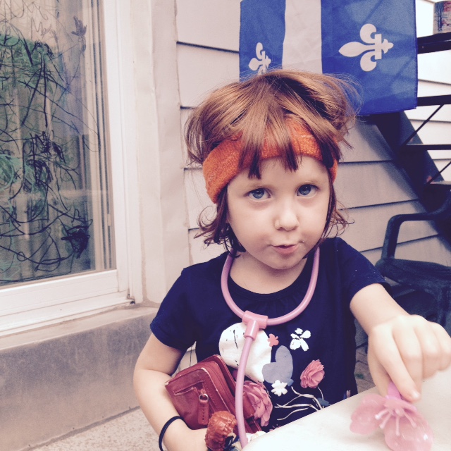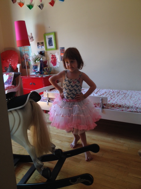 Elle se regarde dans le miroir en faisant la ballerine. Avec un jupon à moi. Que je porte quand je me déguise en licorne (deux ou trois fois par année).